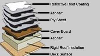 There are basically two types of built-up roofing (also known as BUR). The difference is that either a coal tar pitch or asphalt waterproofing could be used as the waterproofing element between plies of reinforcing felt. There are advantages and disadvantages to each system.
